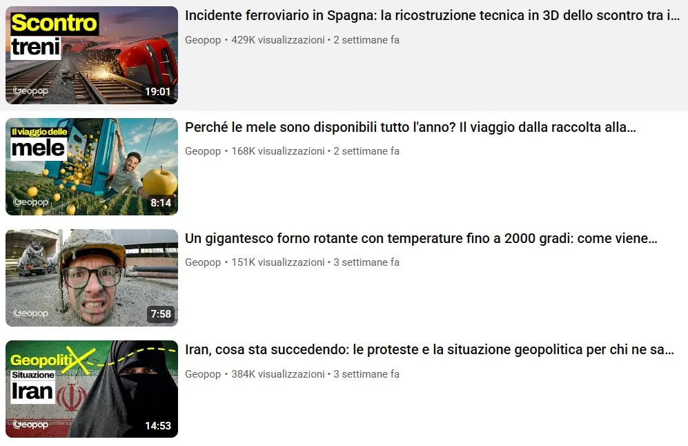 Infatti non c’è incendio, frana, disastro aereo o ferroviario che non venga prontamente seguito da un approfondimento scientifico (sic) di Geopop con tanto di video ricostruzione 3D (direi ormai la loro signature move, la loro reinterpretazione dei plastici di Vespa). La tragedia diventa immediatamente contenuto.